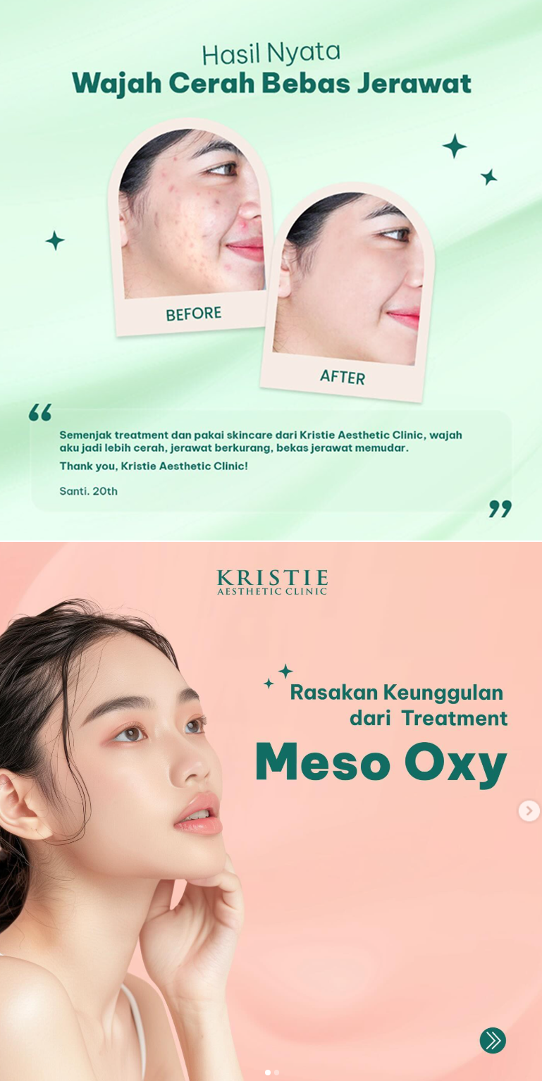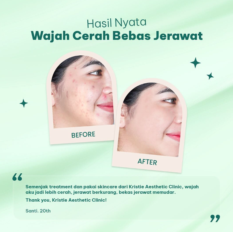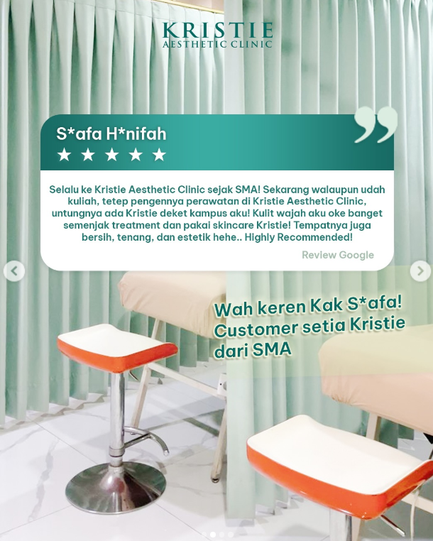 “Semenjak treatment dan pakai skincare dari Kristie Aesthetic Clinic, wajah aku jadi lebih cerah, jerawat berkurang, bekas jerawat memudar.”